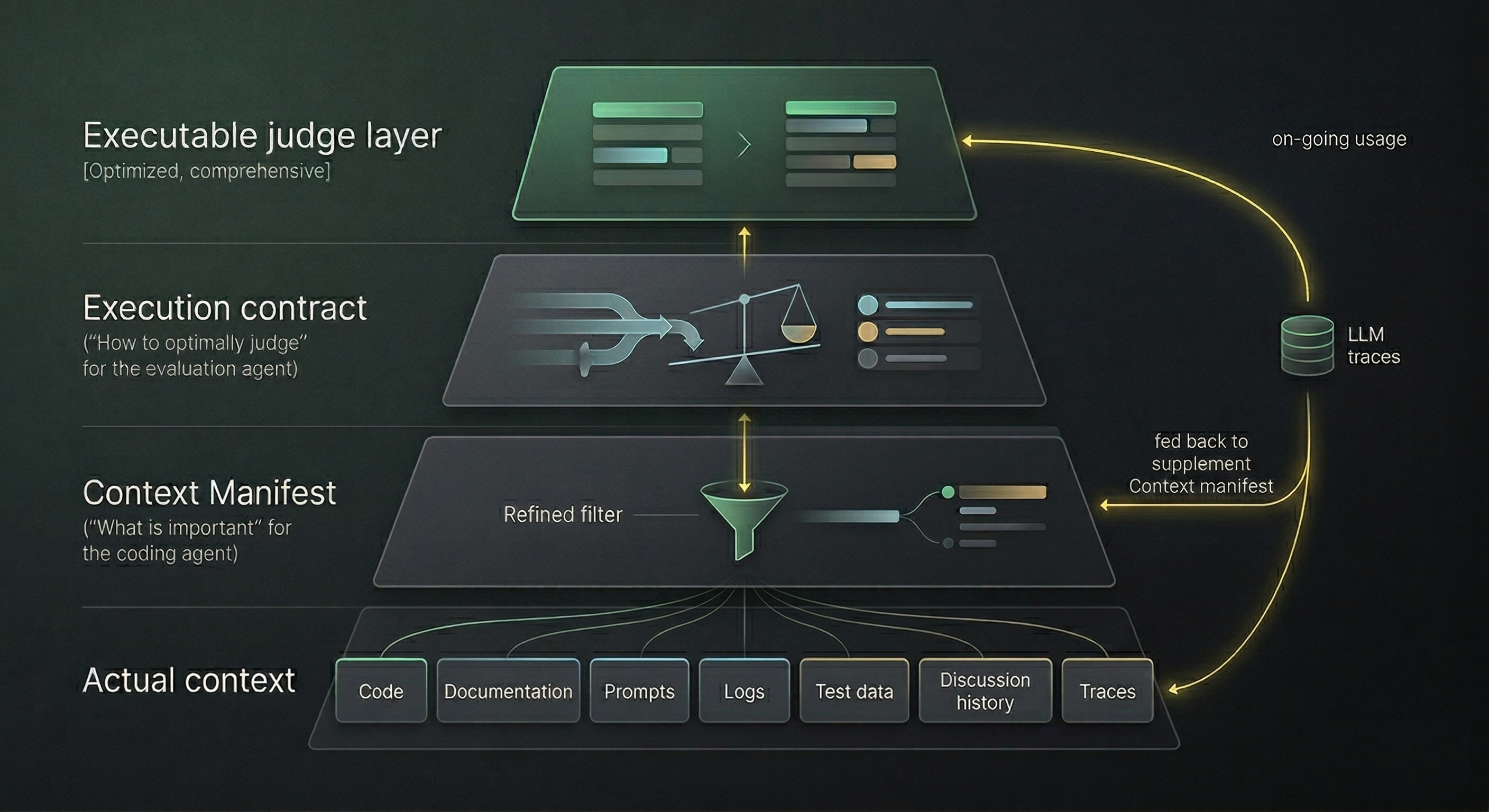 TL;DR: Your coding agent assembles a Context Manifest: a minimal, structured package of everything relevant to define the semantics of each non-deterministic (LLM) call in your application. Those semantics are often captured in side information such as prompts, code references, policies, examples, constraints, and documentation. A distinct meta evaluator then turns that manifest into an Execution Contract which defines what successful behavior looks like and how it should be judged, and compiles that into executable scorers. Your coding agent then integrates the scorers in proper locations in the code.